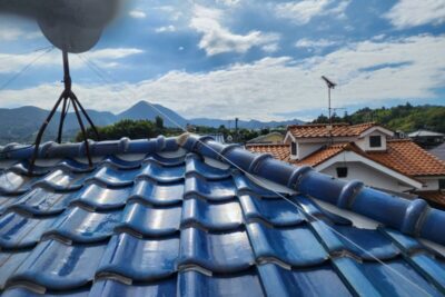 愛媛県伊予郡T様邸にて屋根の漆喰修繕工事を行っております。 屋根の棟部分にある面戸と言われる部分のセメントが剥がれ落ちているため、修繕工事のご依頼を受けました。 施工前 築30年程の釉薬瓦を使用した寄棟の屋根になっているため棟の数が多く今回修繕する面戸と呼ば・・・