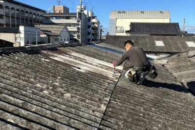 愛媛県松山市で事業をされている株式会社H様社長様より雨漏りについてのお問い合わせを頂いていた現場の修繕を行いました。 現状倉庫天井からの雨漏りを起こしているとのことでした。 調査の結果経年劣化によって出来た波型スレートにひび割れがみうけられ亀裂部分から・・・