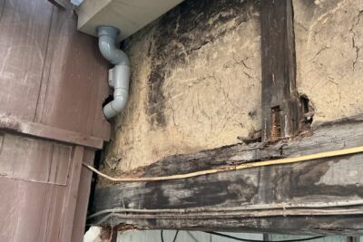 愛媛県喜多郡内子町にお住いのS様邸にて玄関上庇の解体・新設工事をおこなっております。 築50年程の住宅になります。外壁の修繕工事のご依頼を頂いていたのですが、玄関上の庇に違和感があり よく見てみると結構な度合いで垂れ下がっています。 よく見ると庇が半分くらい垂れ下がって・・・