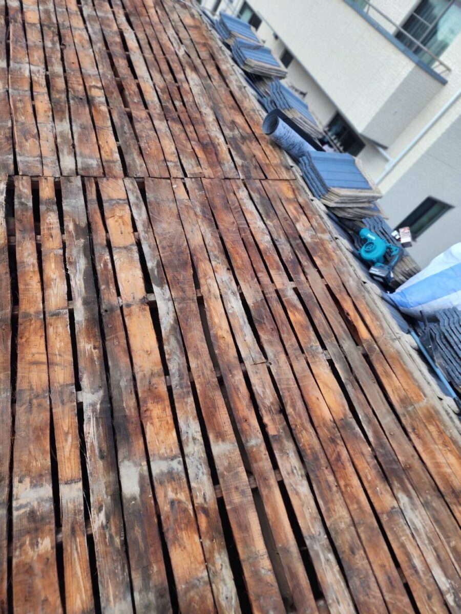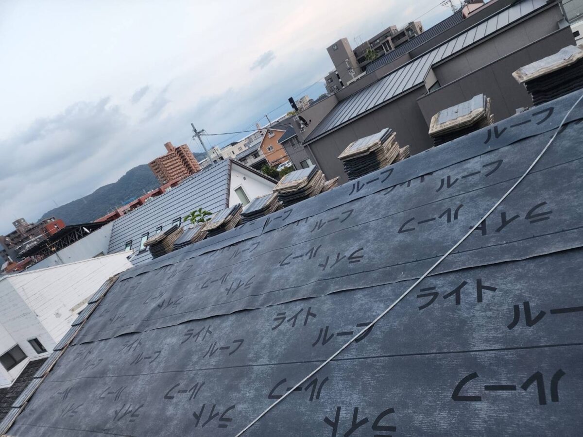 下葺き材のルーフィングを張りなおすことによって強風時などに侵入してくる雨水をルーフィングが屋根の外にだしてくれます。