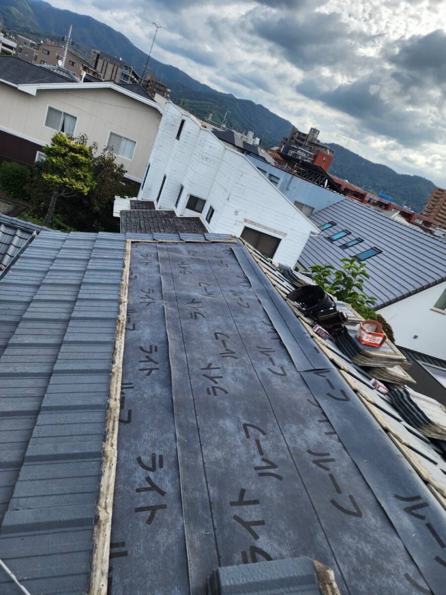 既存の瓦を丁寧に剝いでいきいき、古くなったルーフィングをはがしていきます!