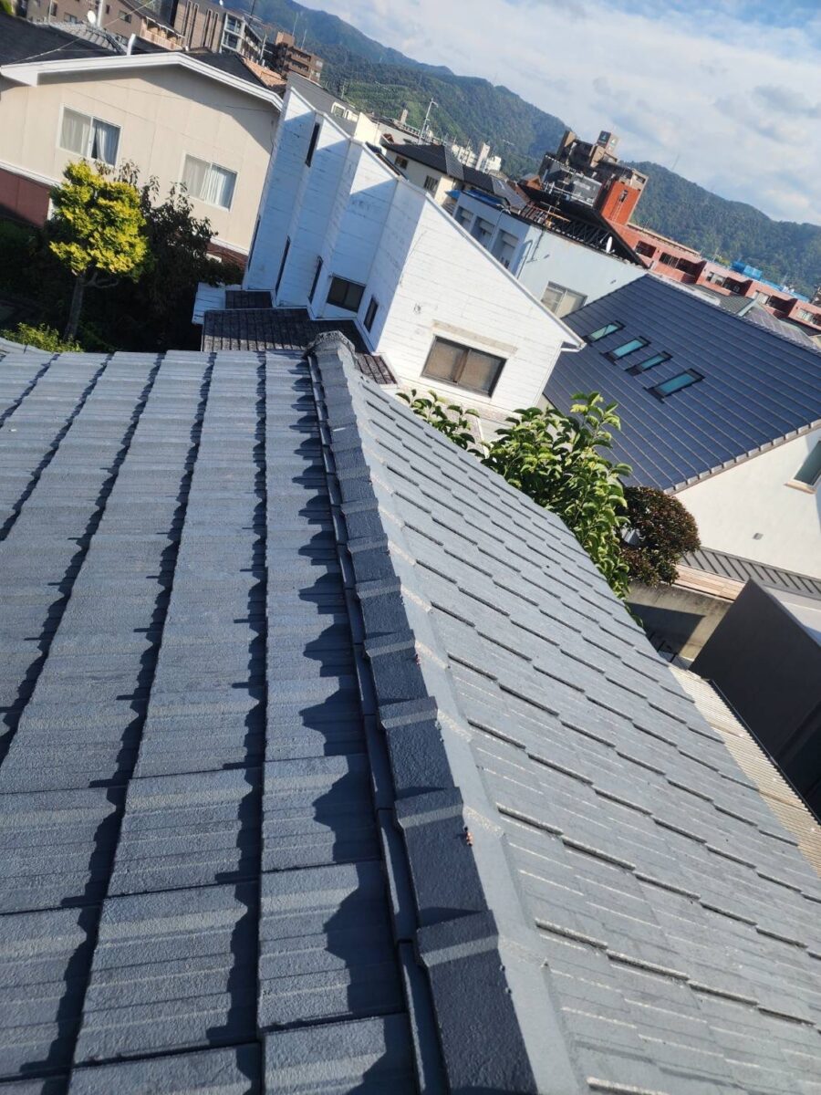 屋根に上がり調査開始です。屋根の形状はS型スレート瓦でしっかり塗装もされており、きれいな状態でした。