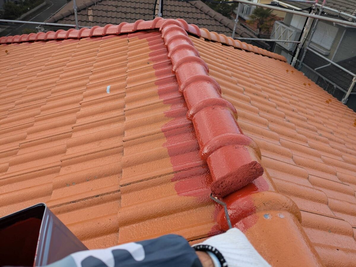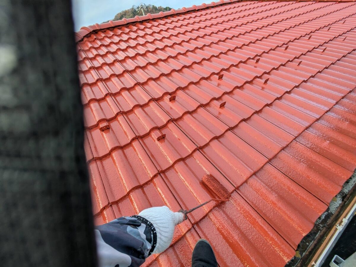 上塗りと同じとなるファインパーフェクトベスト赤さび色を塗布していきます。