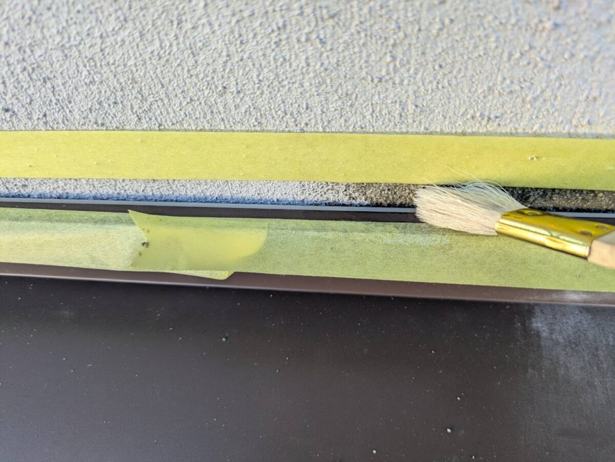 コーキングの接着をよくするためプライマー処理し、壁との接着箇所、板金の重なる箇所に変成シリコンコーキングでしっかりと固定し隙間を埋めます!