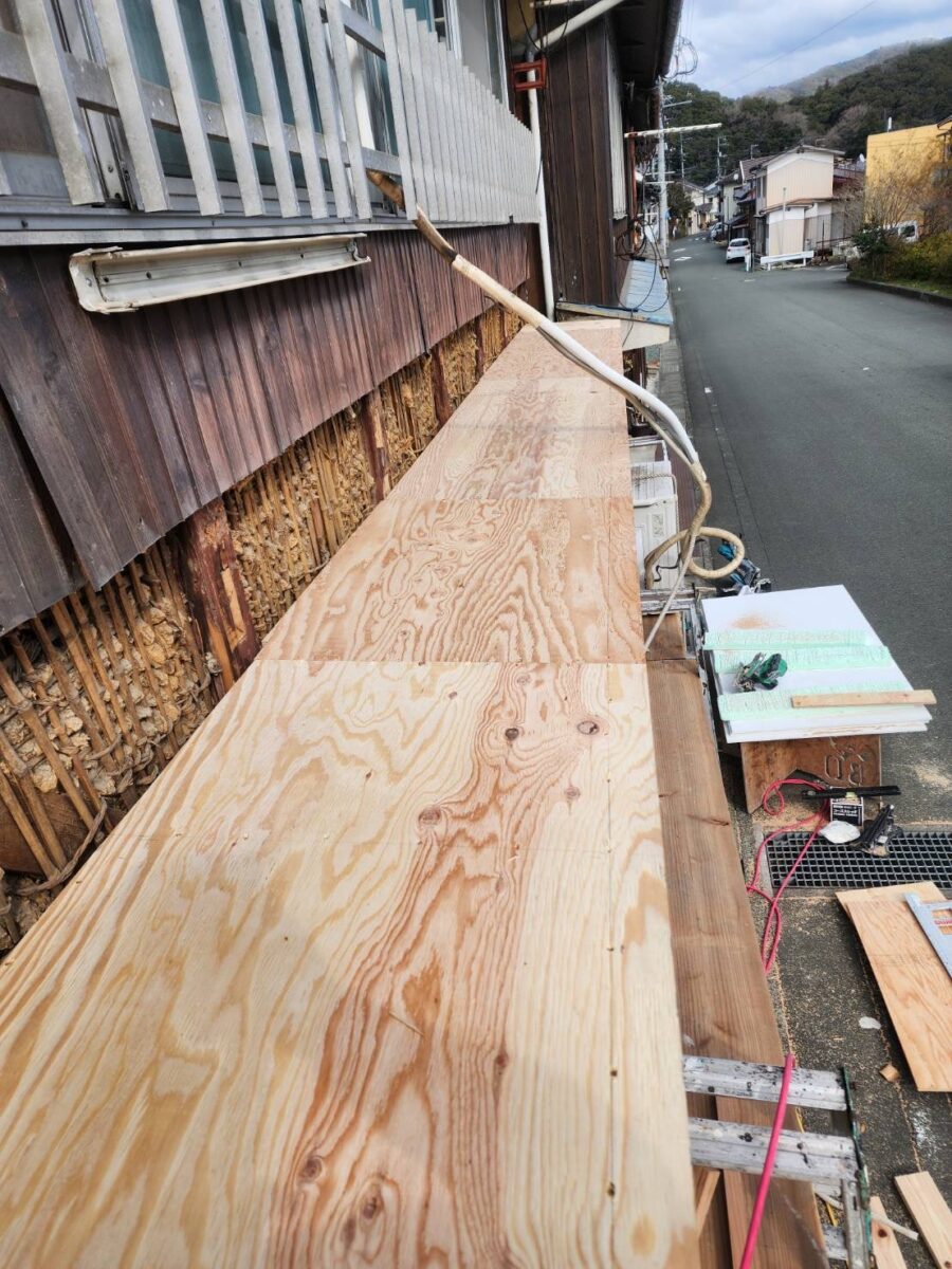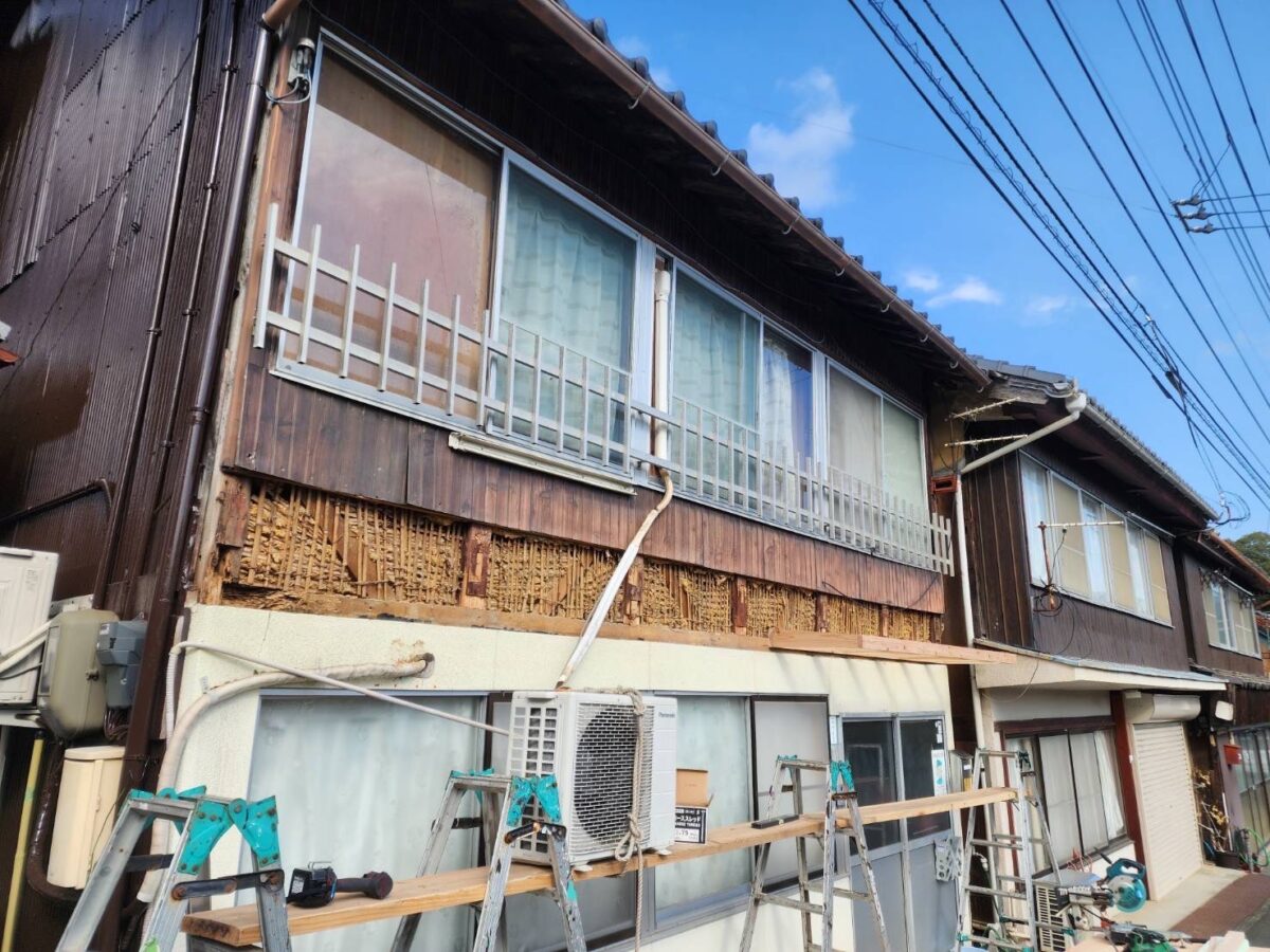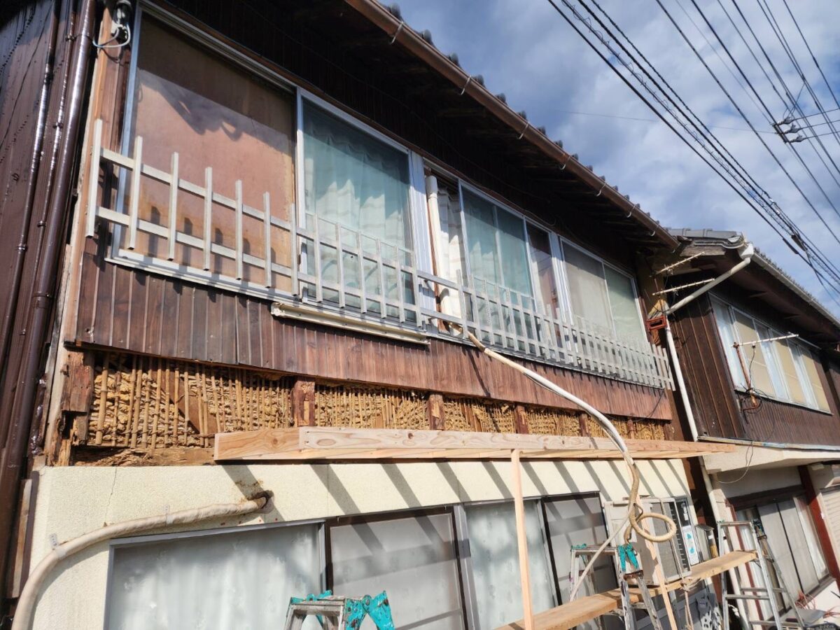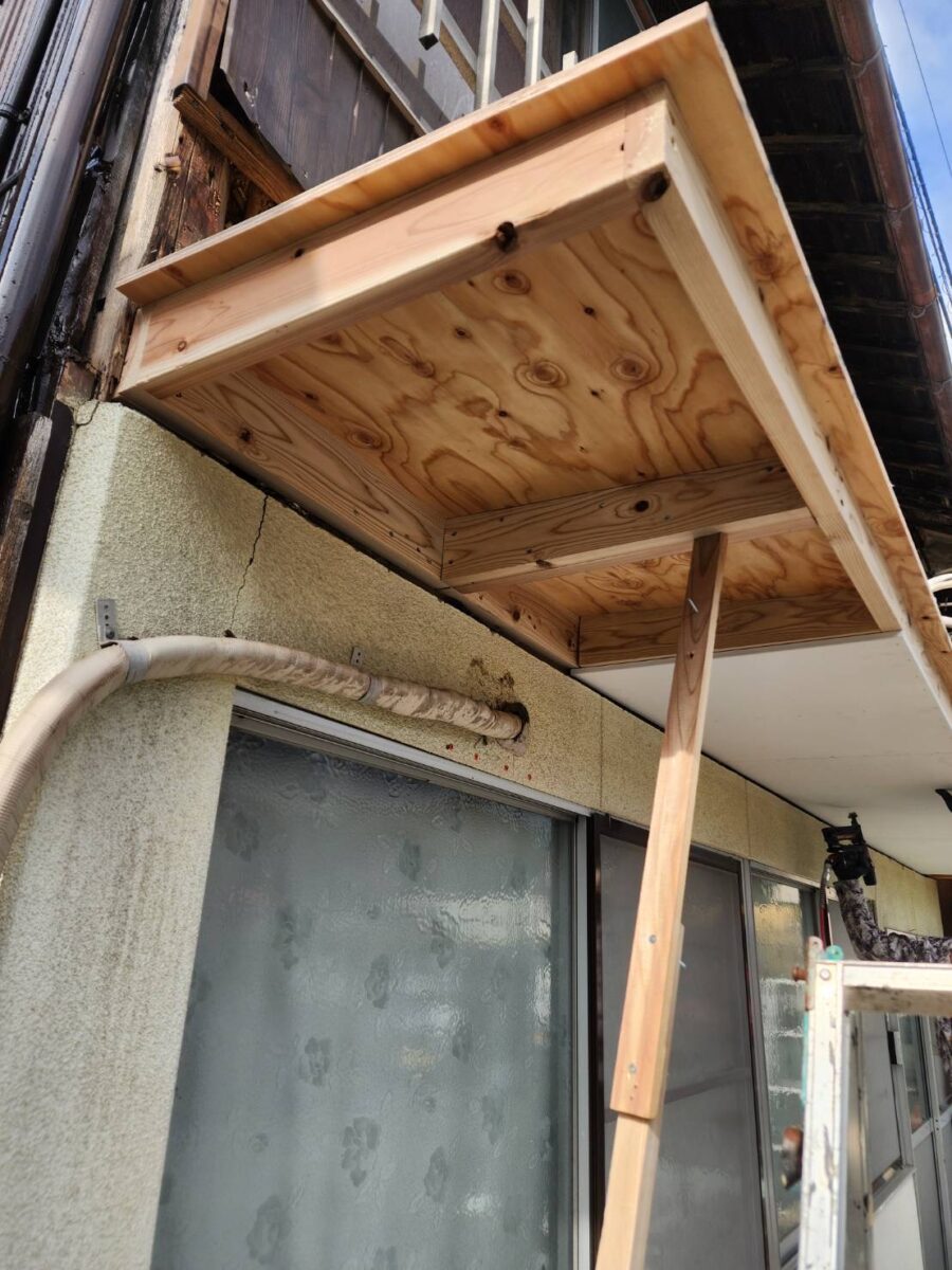 先日までに傾いてしまった庇の解体が終わってますので、下地を一から組み直す大工作業からとなります。