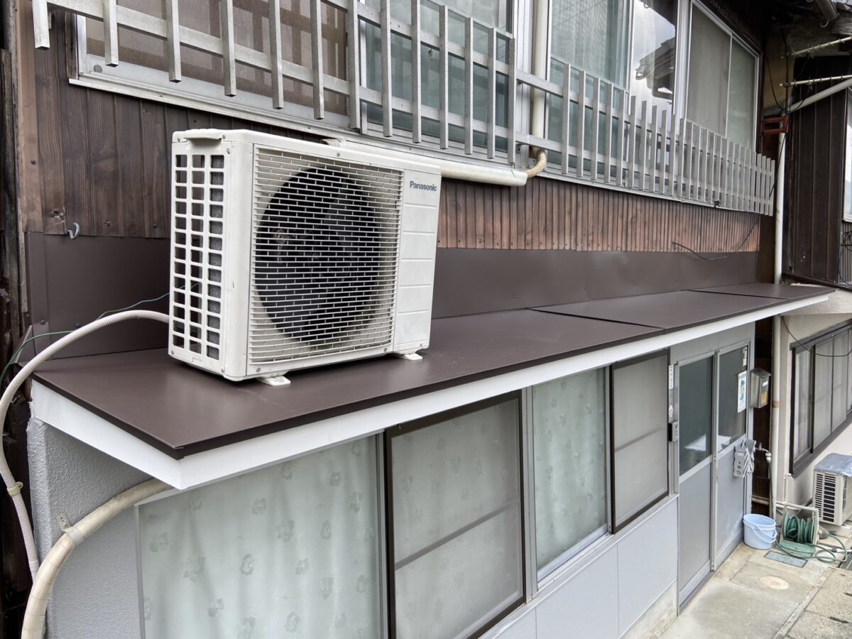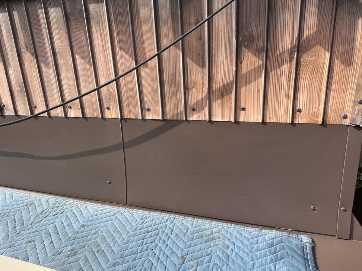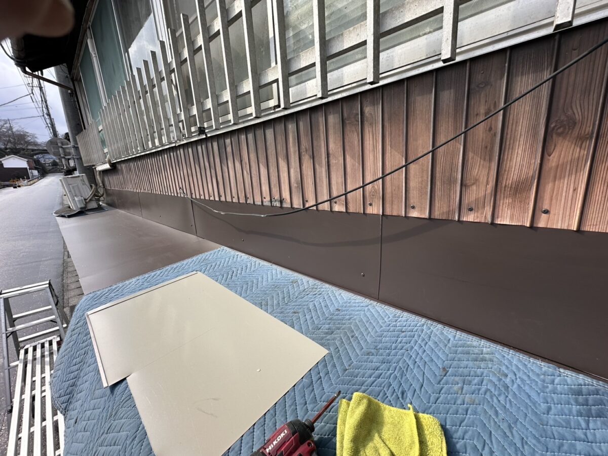庇の板金が錆びをおこし、雨水が入る隙間ができてしまい塗装では補えない経年劣化起こし、庇全体が傾いてしまっているため、解体・新設をおこなっていきます!