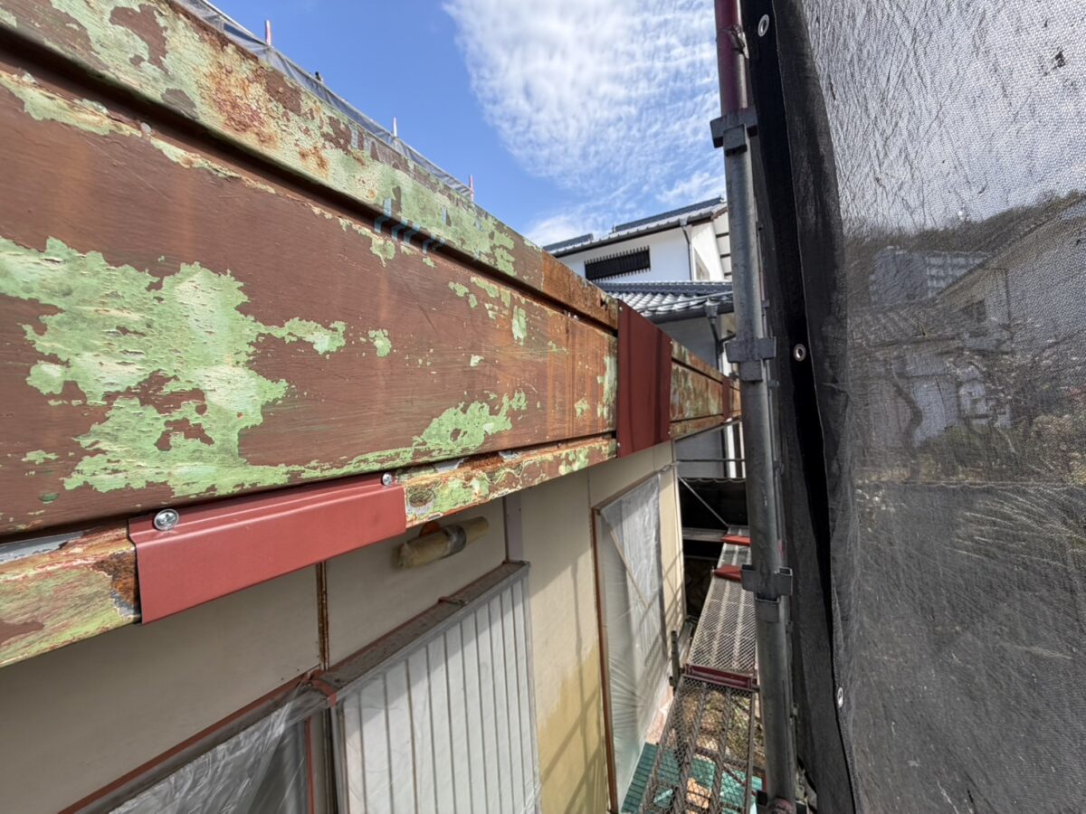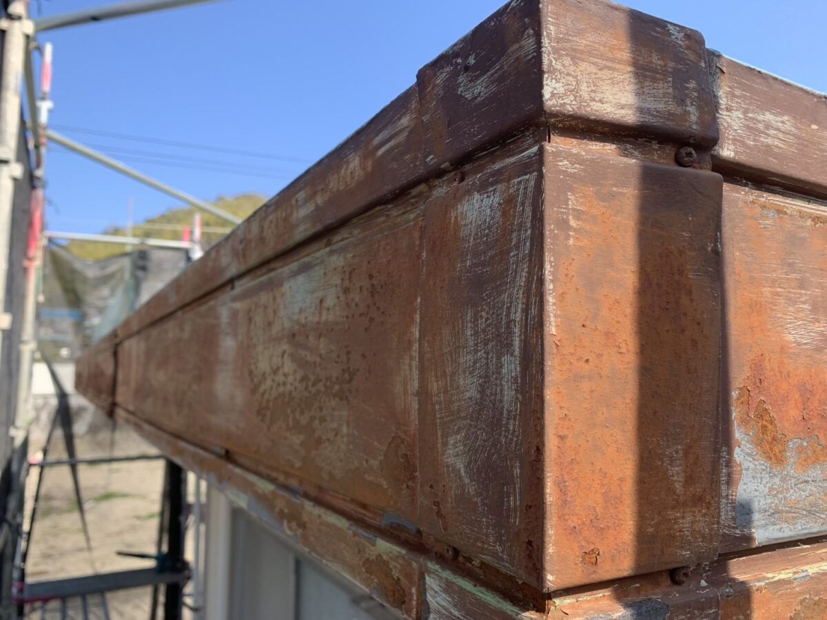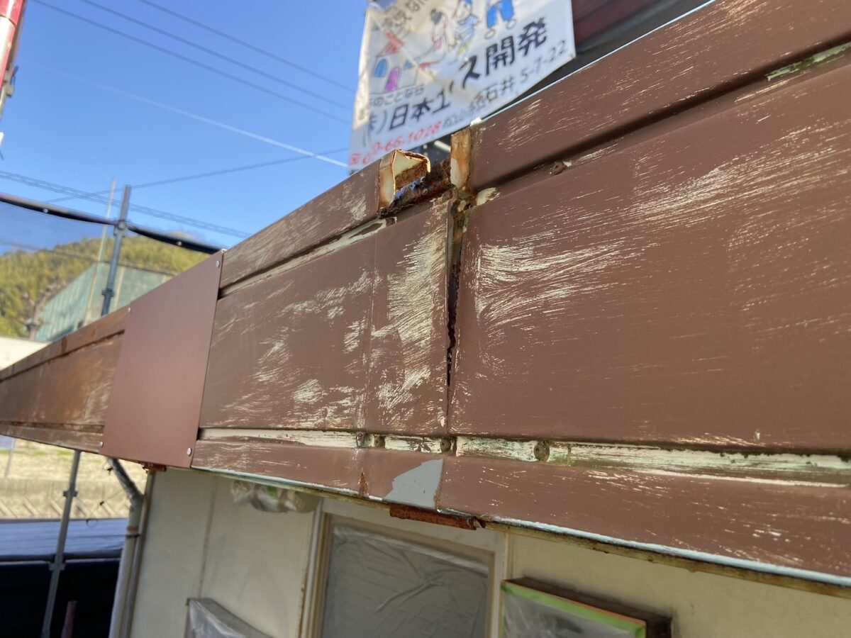 屋根材についても、ガルバリウム鋼板やトタン屋根などの金属系の素材が使われている場合があり、条件によってはサビが発生することがあります。こちらは比較的軽度なサビのため、簡単な補修で対応が可能な状態でした。今回は築40年を経過した建物で、このようなサビが見られましたが、できれば10年に一度を目安に、点検やメンテナンスを行っていただくことで、より良い状態を保ちやすくなります。