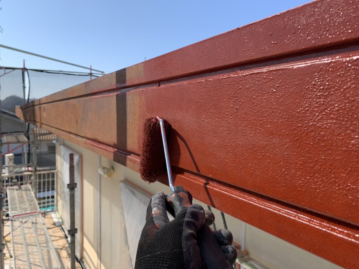 錆止め材の塗布が完了しました。この後、上塗り材を塗布して仕上げを行い、塗装工程はすべて完了となります。上塗り材には、基本的に外壁と同じ塗料を使用し、周囲との色や質感に違和感が出ないよう仕上げていきます。