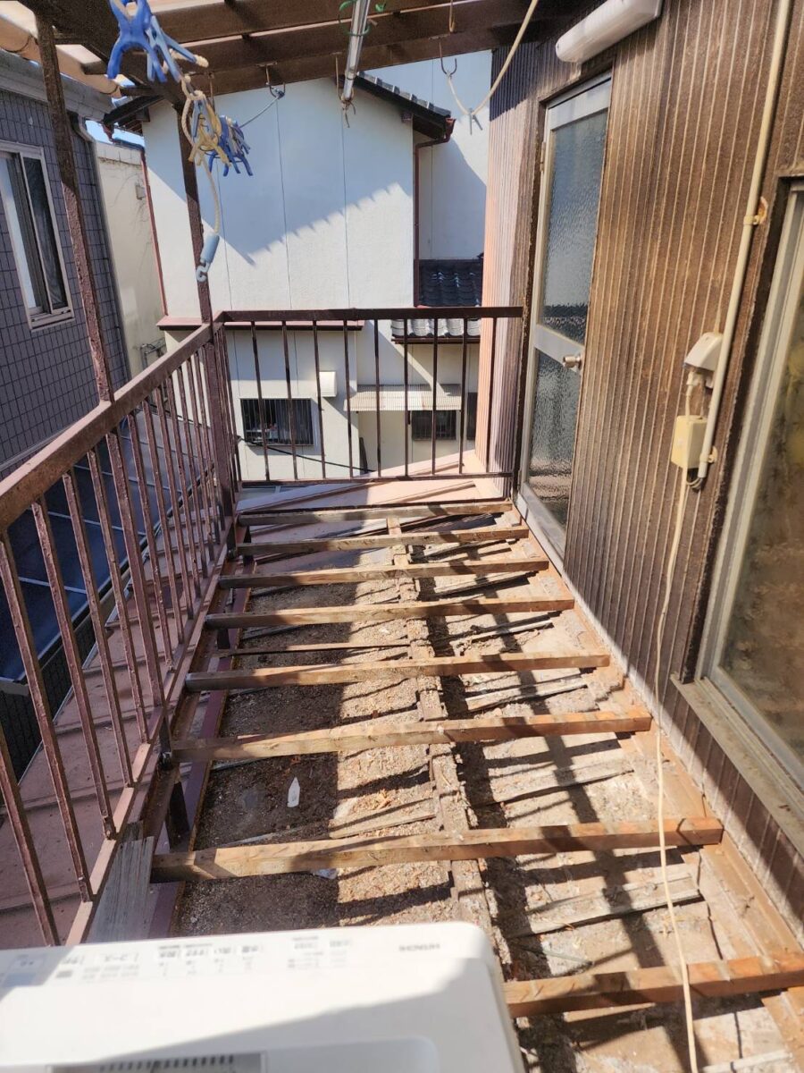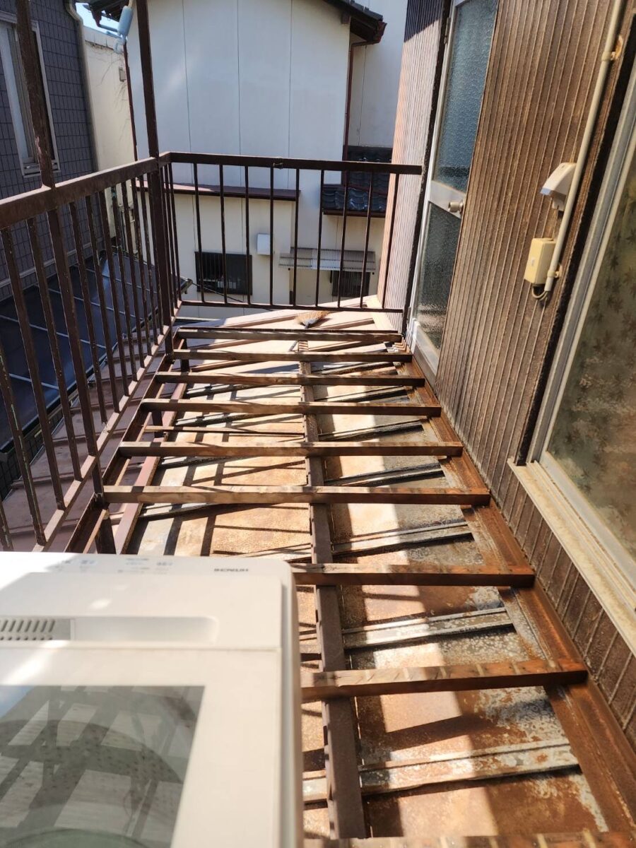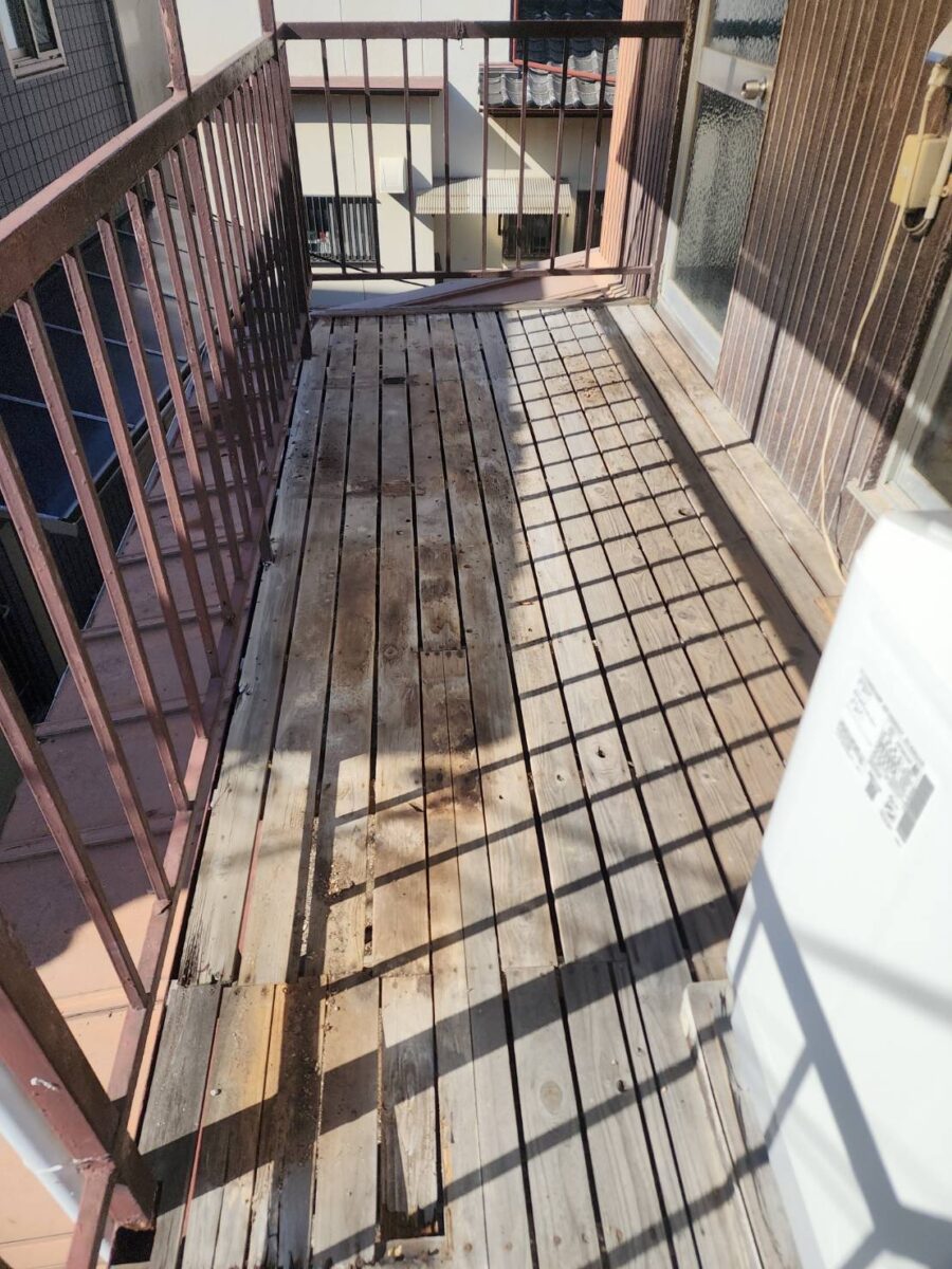 現地調査を行った結果、天然板の床材は腐食し抜け落ちており、ベランダには洗濯機が設置されておりました。