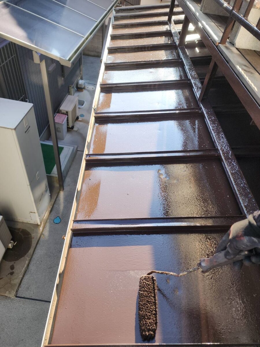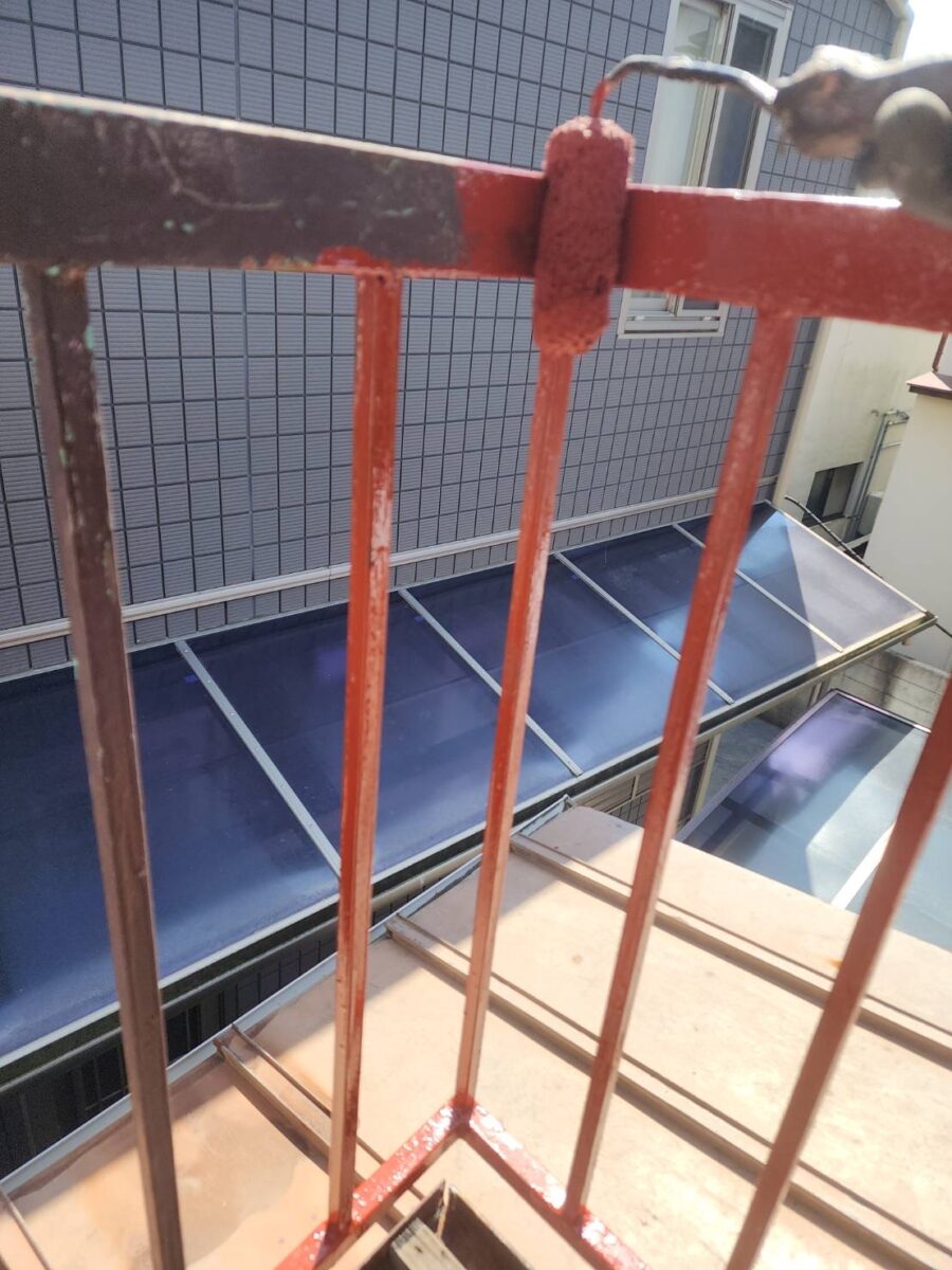 屋根部分、手すり部分、ベランダ鉄骨部分下地処理が終われば上塗り作業を行っていきます!