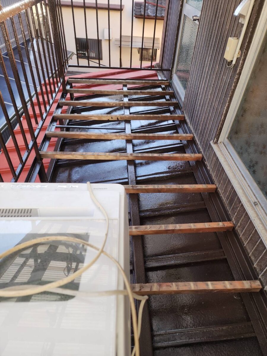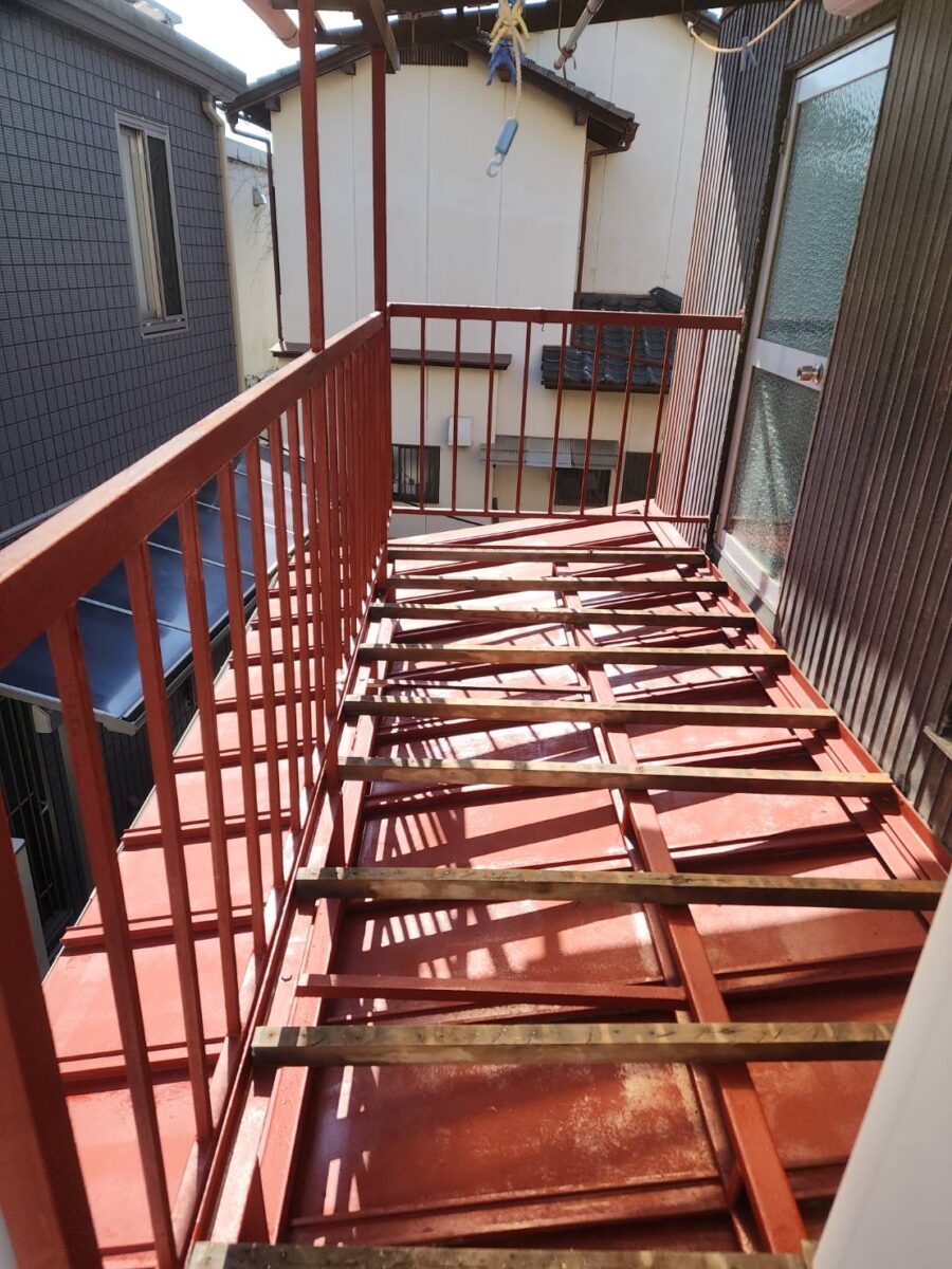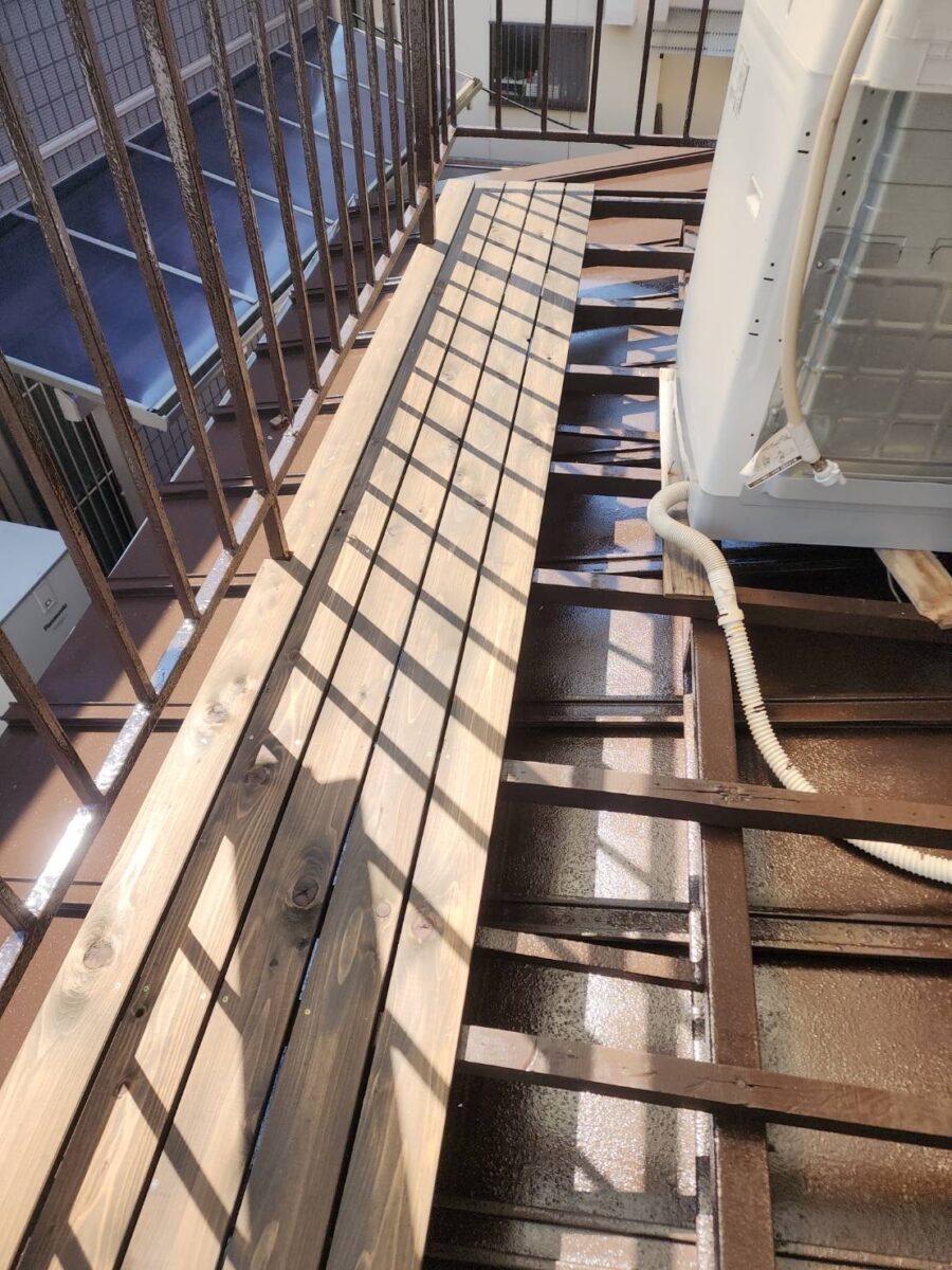 お客様との打ち合わせのうえで、できる限りコストを抑えて修繕したいとの事で、今回はベランダの床の張り替え、ベランダ廻りの鉄部の塗装にて修繕をご提案させていただきました。
