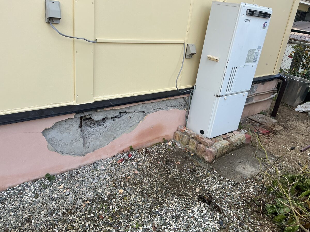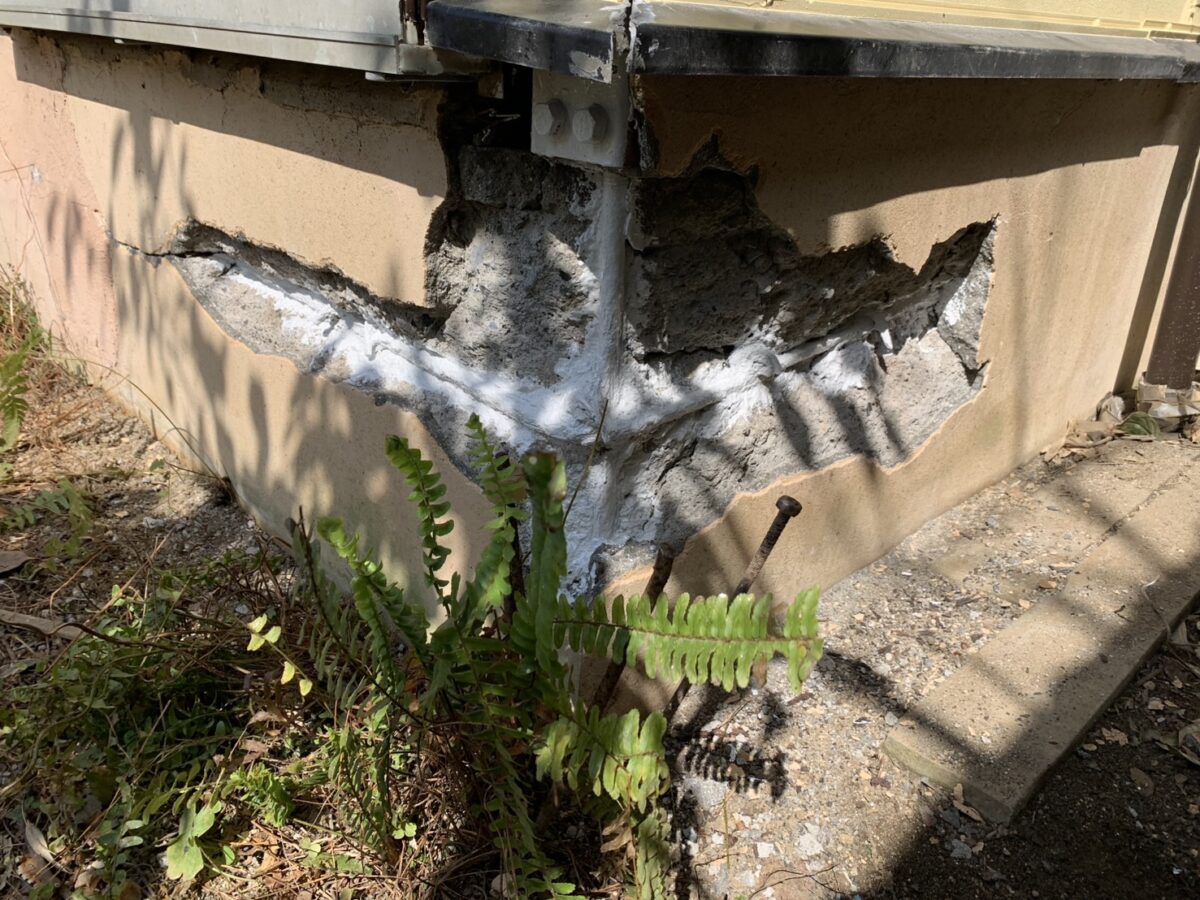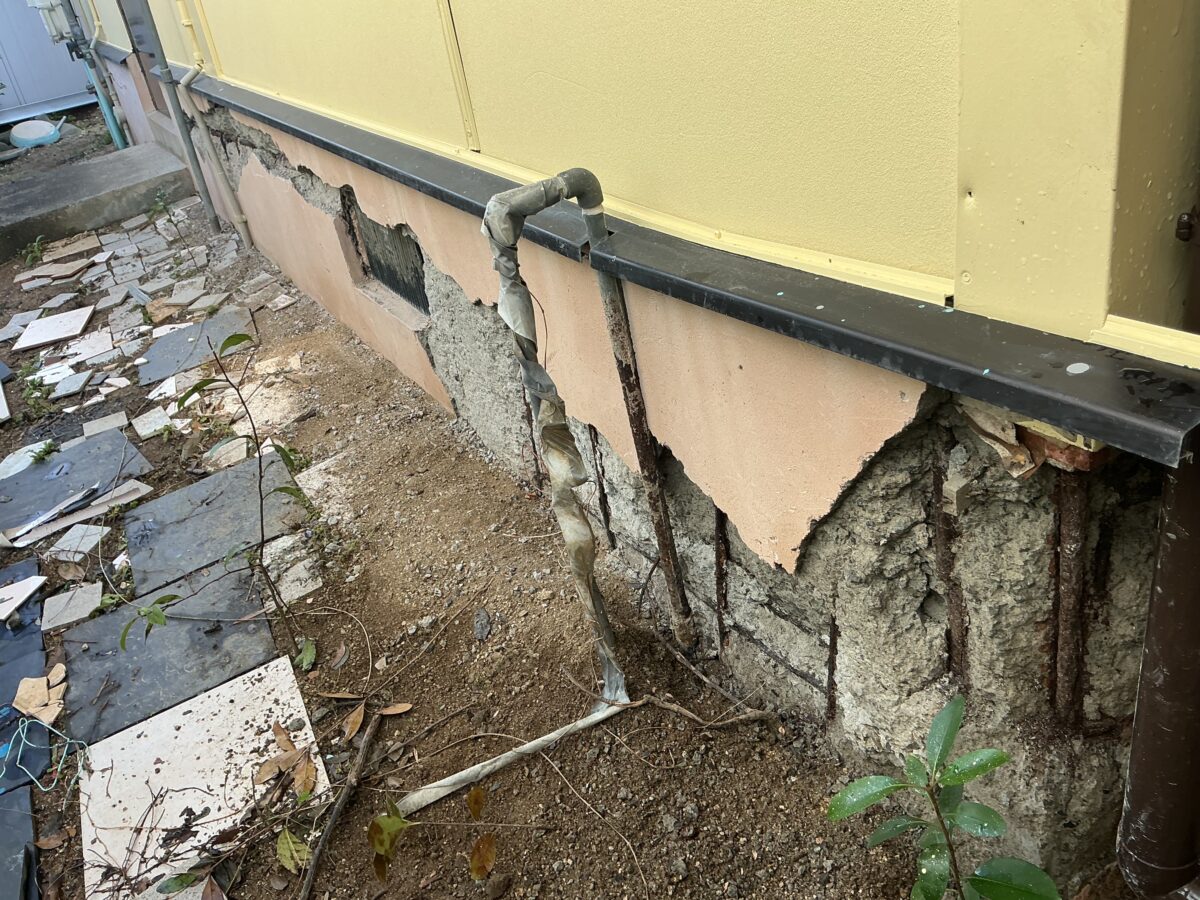 鉄筋が露出してコンクリートが剥がれている状態は、基礎の耐久性が大きく損なわれているサインです。