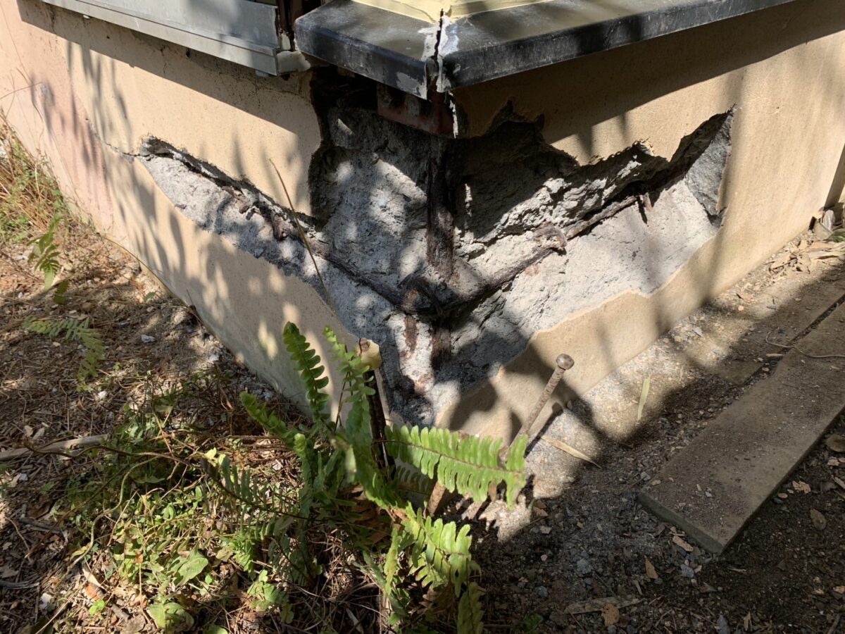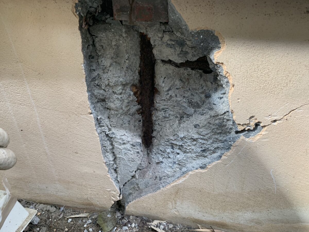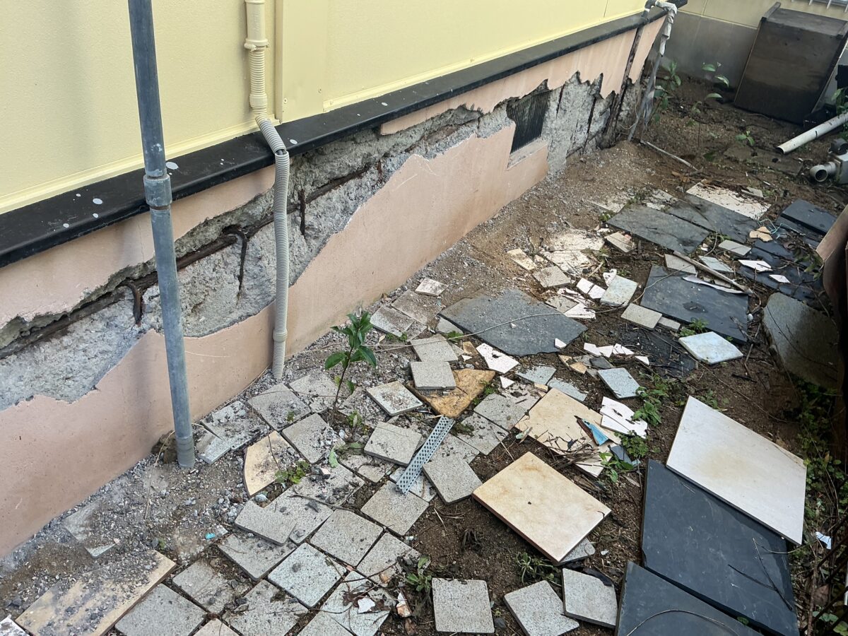 鉄筋が露出してコンクリートが剥がれている状態は、基礎の耐久性が大きく損なわれているサインです。