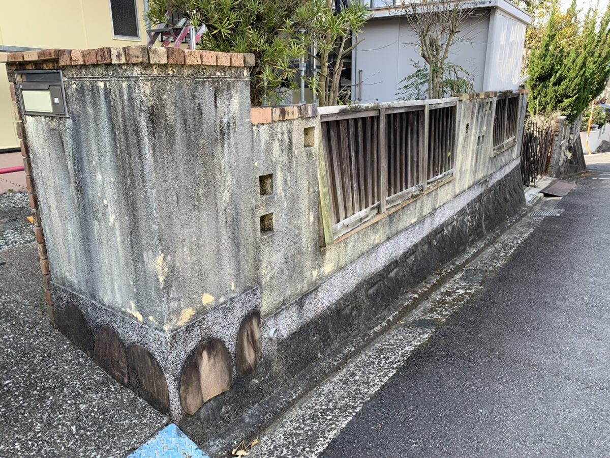 ウッドフェンスの根元が朽ちて強い風などが吹けば今にも飛んでいきそうな状態です。