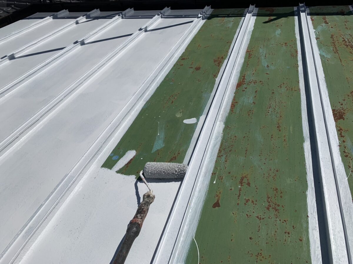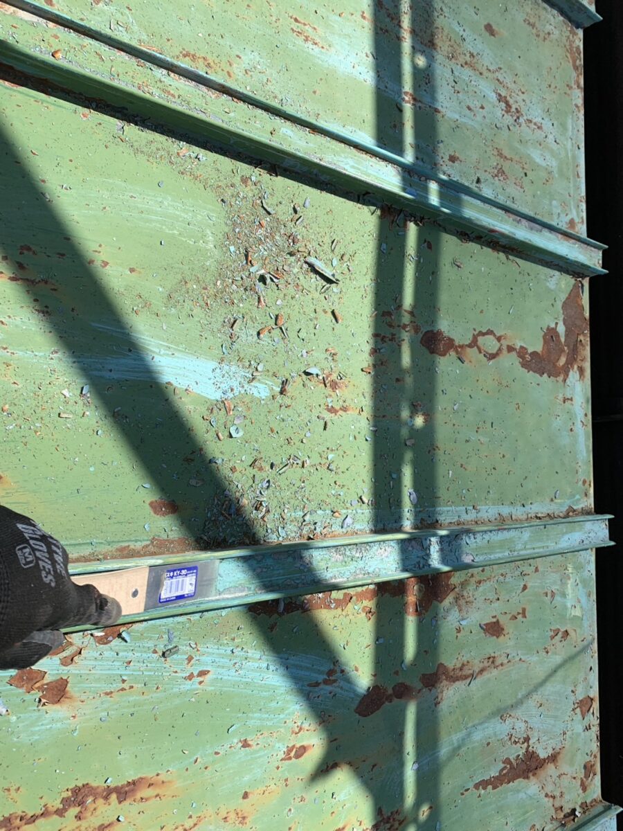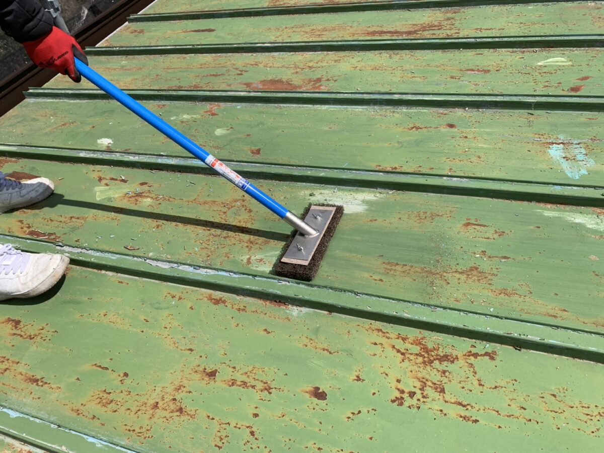 トタンを含む金属建材を塗装する際は,ケレンでサビを除去する作業をはじめにおこないます。併せて、トタン屋根の表面にタワシを使って微細な傷をつけます。