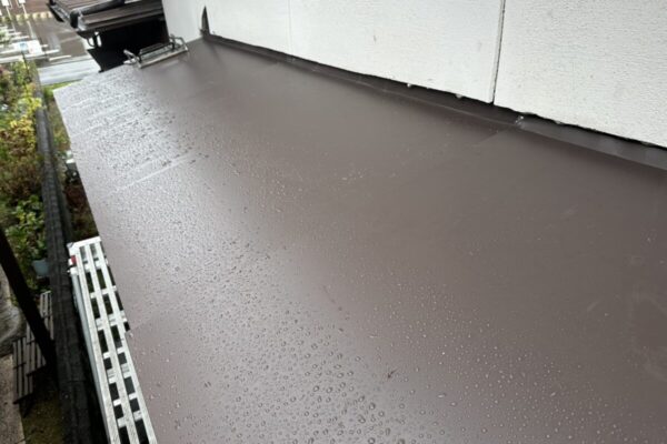 前工程で塗ったシーラーは色が透明なのでわかりにくいですが中塗りでは仕上げの色となる塗料の1回目をローラーで塗っていきます。使用した塗料は日本ペイントのファインパーフェクトベストのJブラックです。中塗り1回だけだと仕上がりにムラが起こってしまったり、メーカーの施工仕様にある指定された膜厚まで届かないので、中塗りの後に上塗りを行う必要があります。