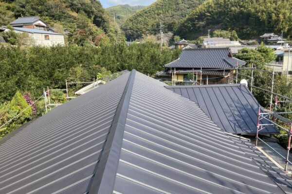 ルーフィングシートを敷き、瓦桟を新しく打ち込んで、瓦を復旧して完成です。