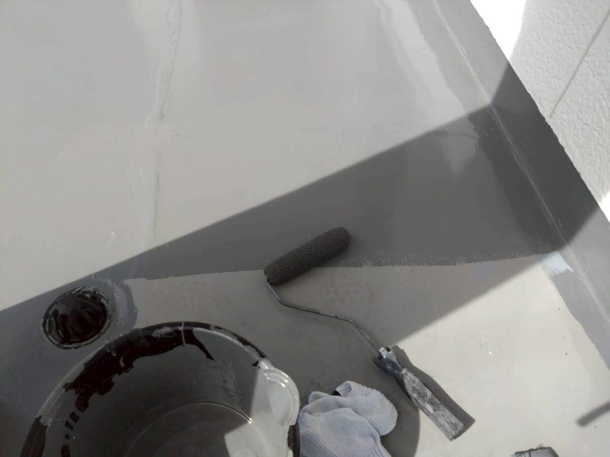最後にトップコートを塗布していきます。ウレタン防水の性能を長期間維持するにはトップコートが不可欠になり、 塗布しないと防水層が紫外線や摩耗で早期に劣化してしまいます。