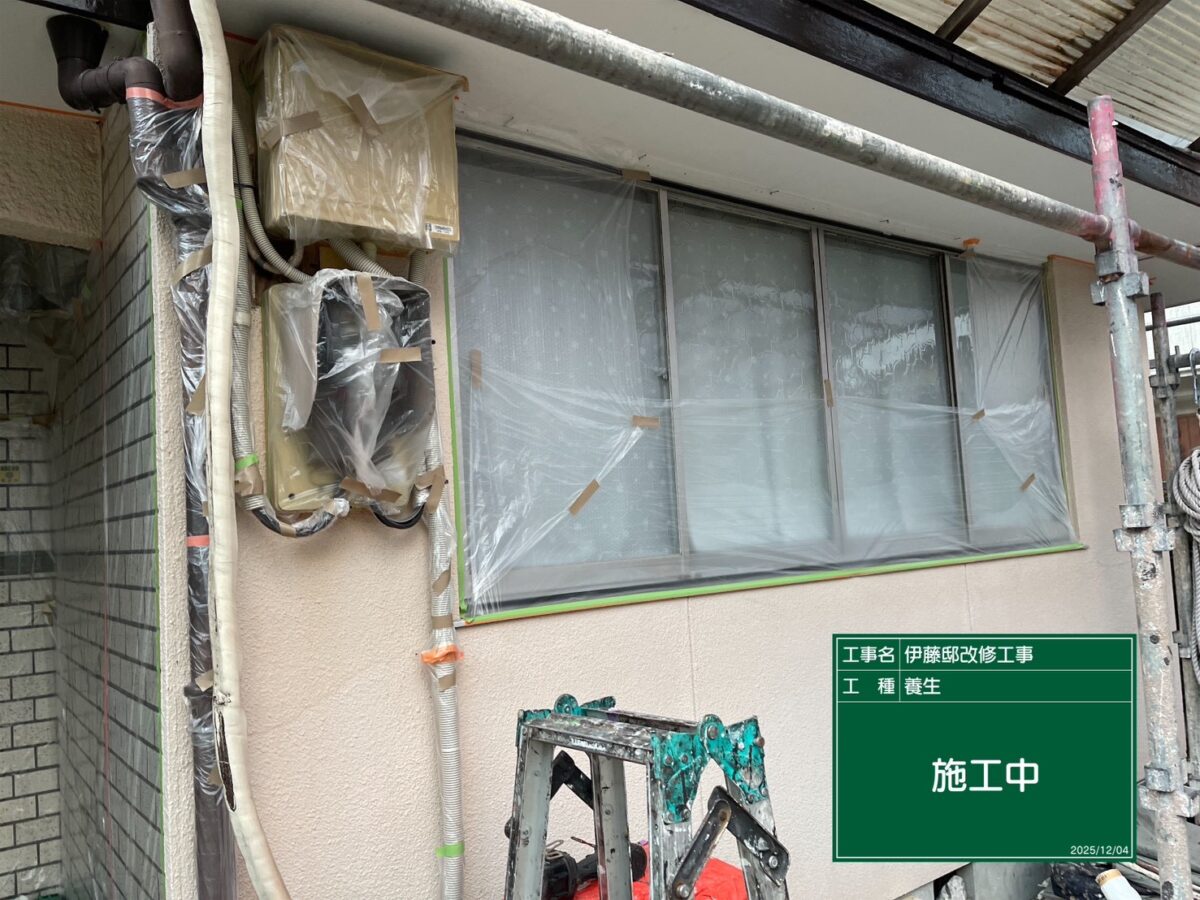 塗装の仕上がりを綺麗にする(きれいなラインを出す)ため窓枠廻りも養生していきます!