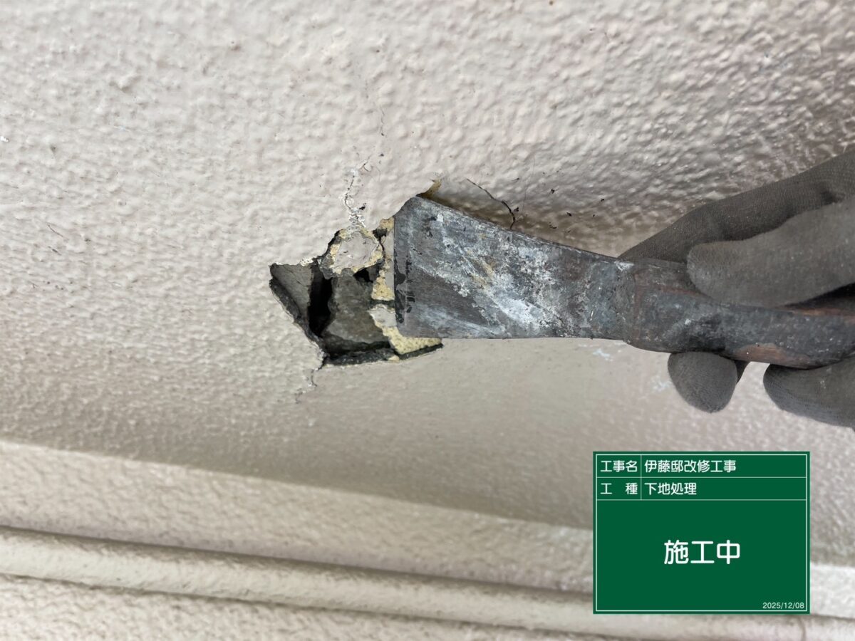 ケレンした個所にプライマーを塗布しメッシュを張りセメントで下地が均一になるように下地調整していきます。